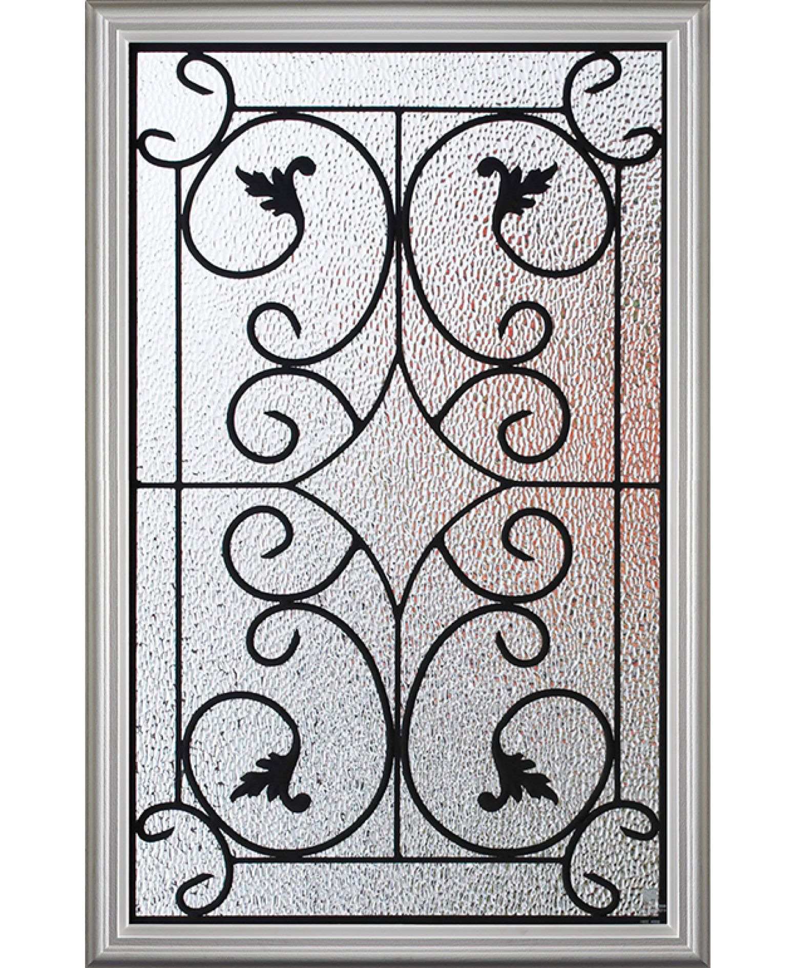 The Wisteria Rectangular Decorative Glass Insert features a flowing wrought iron scroll design inspired by classic botanical forms.